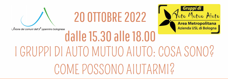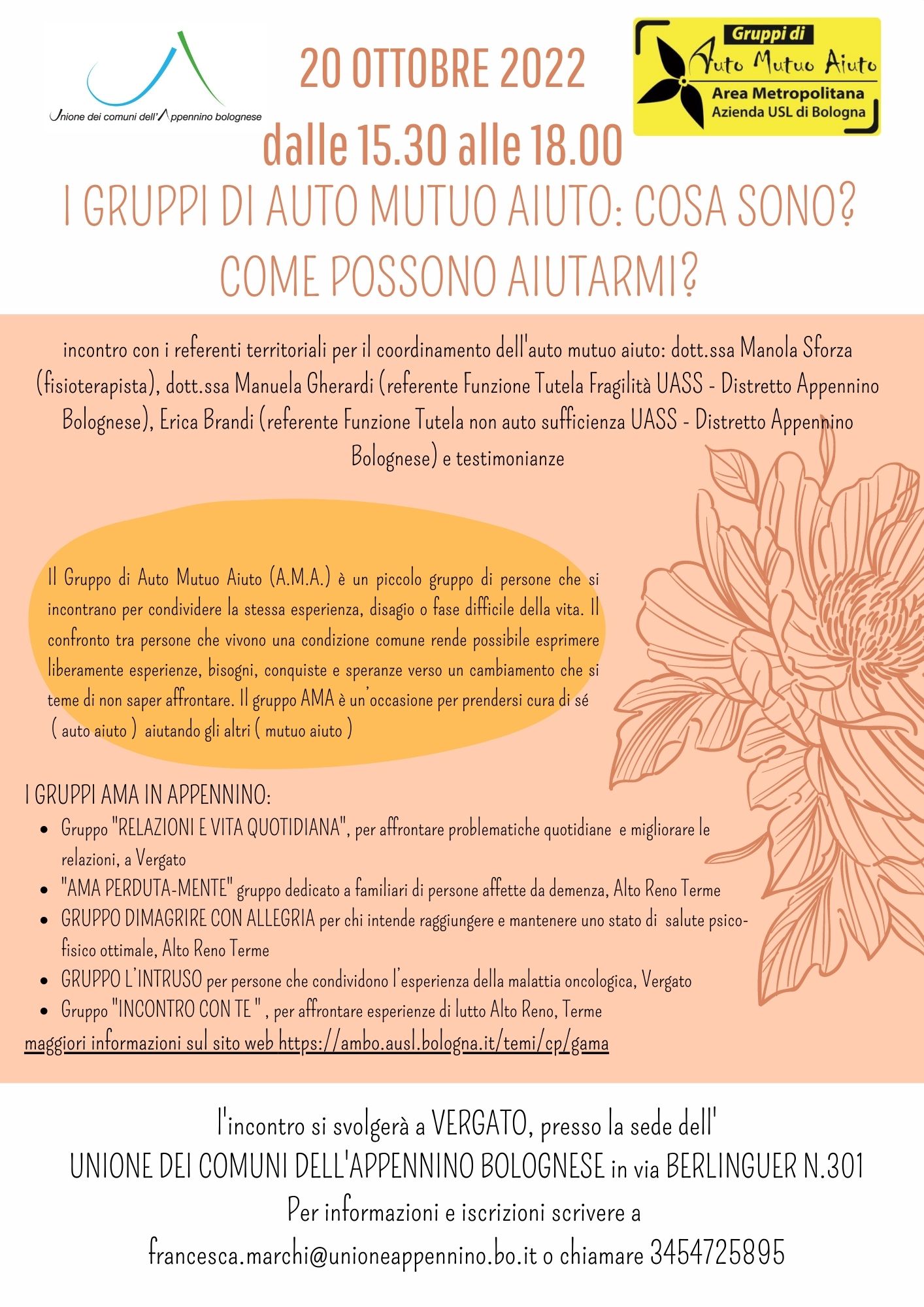 Giovedì 20 ottobre dalle 15.30 alle 18 a Vergato, presso la sede dell'UNIONE DEI COMUNI DELL'APPENINO BOLOGNESE in via Berlinguer N.301, ci sarà un incontro con i referenti territoriali per il coordinamento dell' Auto Mutuo Aiuto: dott.ssa Manola Sforza (fisioterapista), dott.ssa Manuela Gherardi (referente FunzioneTutela Fragilità UASS - Distretto Appennino Bolognese), Erica Brandi (referente FunzioneTutelanonauto sufficienza UASS - Distretto Appennino Bolognese) e testimonianze.