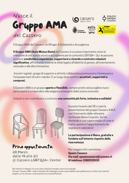 Il Gruppo AMA (Auto Mutuo Aiuto) del Cassero è un passo importante verso la creazione di uno spazio sicuro e accogliente per la comunità LGBTQIA+. Qui, le persone possono condividere esperienze, supportarsi a vicenda e costruire relazioni significative, affrontando insieme le sfide legate all’identità di genere, all’orientamento sessuale e alla discriminazione.
