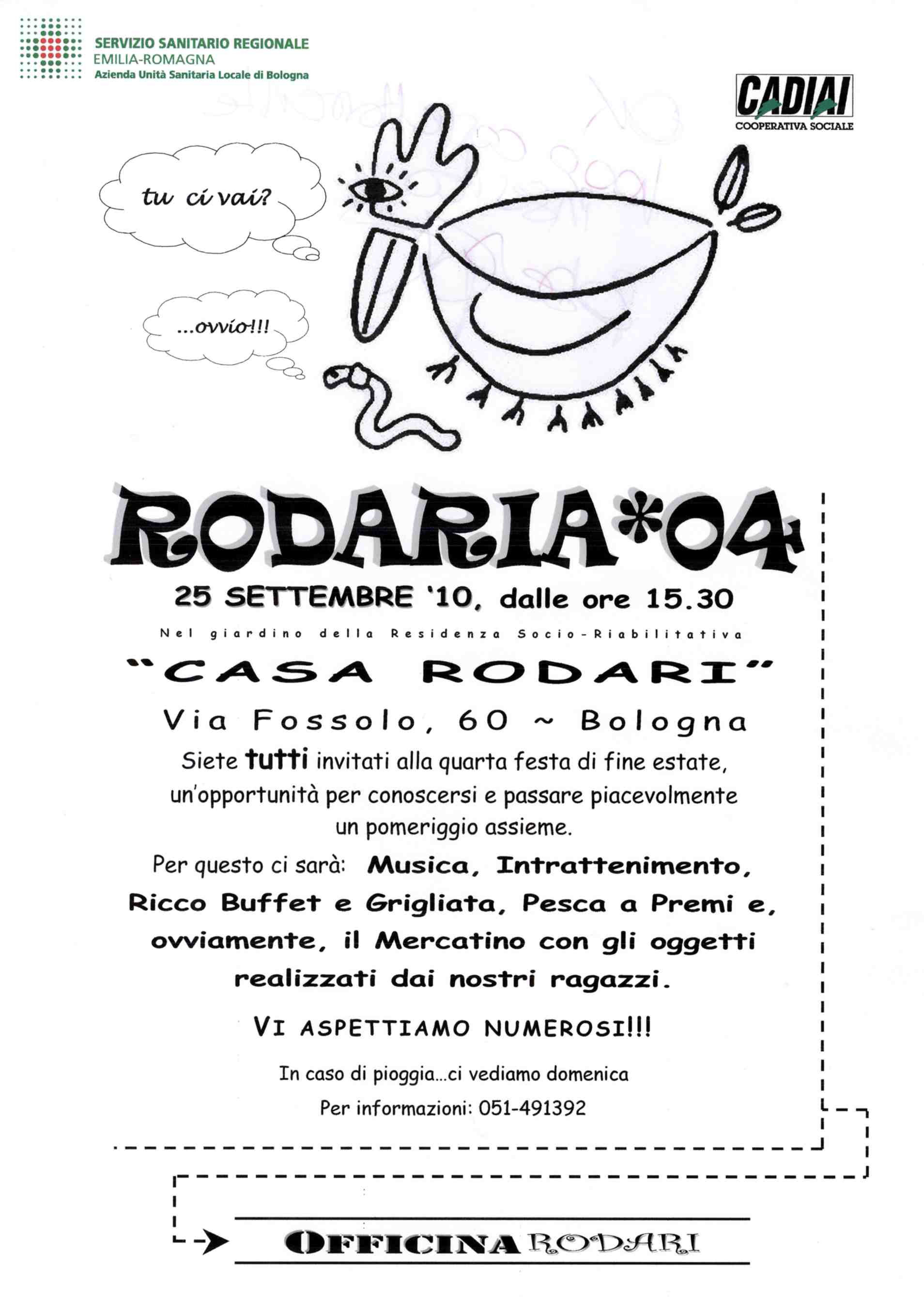 Rodaria *04 è la quarta edizione della festa di Casa Rodari, struttura residenziale a valenza socio-riabilitativa per adulti dell’Azienda USL di Bologna, gestita dalla Cooperativa Sociale CADIAI.