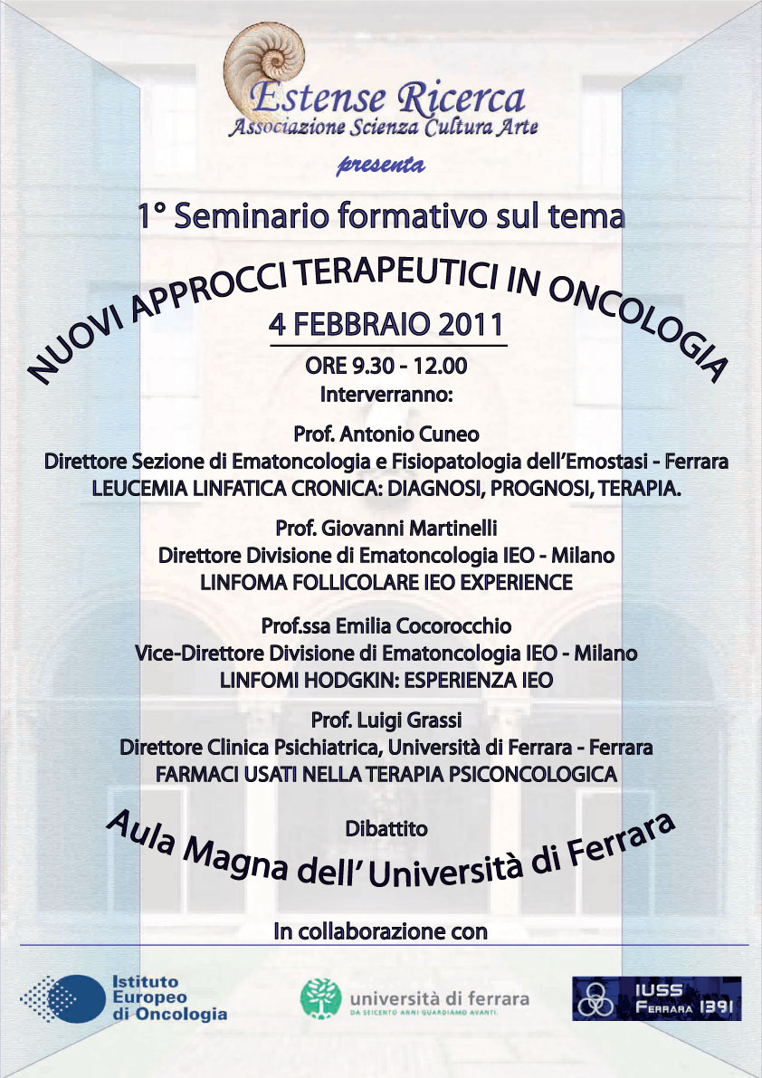 Gli argomenti sviluppati saranno: nuove terapie e farmaci di ultima generazione per la cura di Leucemia linfatica cronica, Linfoma Follicolare, Linfomi Hodgkin, e nella disciplina Psicooncologica.L'evento, pur dedicato a studenti e professionisti del settore, è aperto a tutti i cittadini.