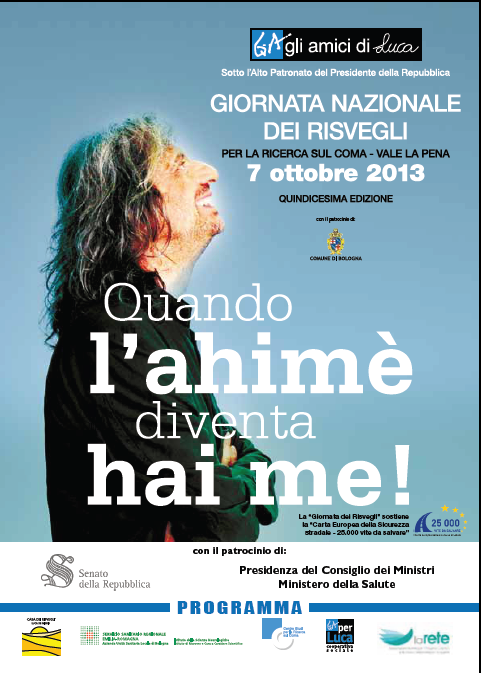 Giornata nazionale dei Risvegli - Quindicesima edizione. Per la ricerca sul coma - vale la pena. Quando l'ahimè diventa hai meProgetto L.U.C.A. "Link united for Coma Awakenings" - 1° Meeting Internazionale https://www.ausl.bologna.it/eventi/archivio/auslevent.2013-09-26.7914087699https://www.ausl.bologna.it/eventi/archivio/auslevent.2013-09-26.7914087699/@@download/image/Risvegli locandina.bmp