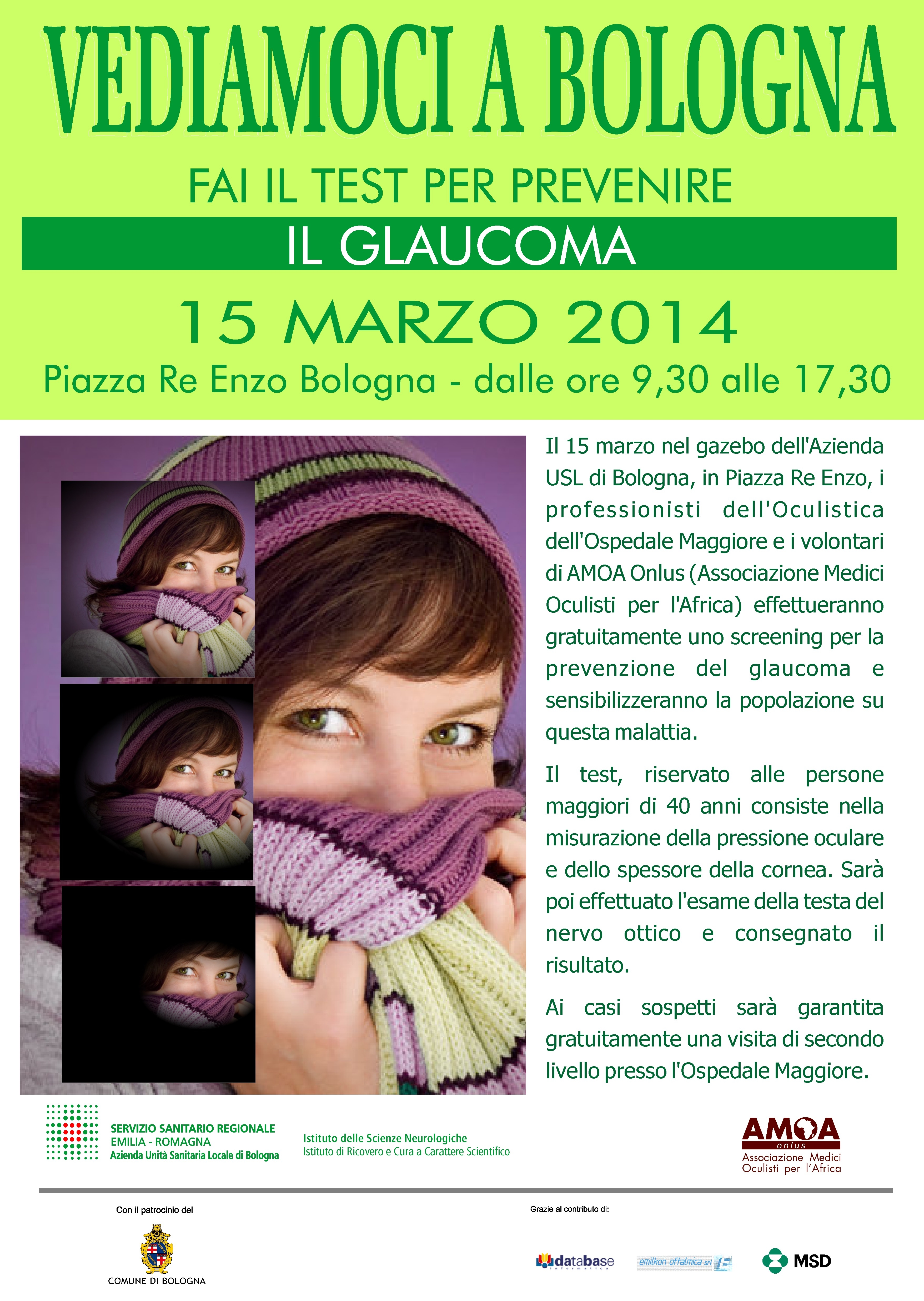 Il 15 marzo nel gazebo dell'Azienda USL di Bologna, in piazza Re Enzo, i professionisti dell'Oculistica dell'Ospedale Maggiore e i volontari di AMOA Onlus (Associazione Medici Oculisti per l'Africa) effettueranno gratuitamente uno screening per la prevenzione del glaucoma e sensibilizzeranno la popolazione su questa malattia.