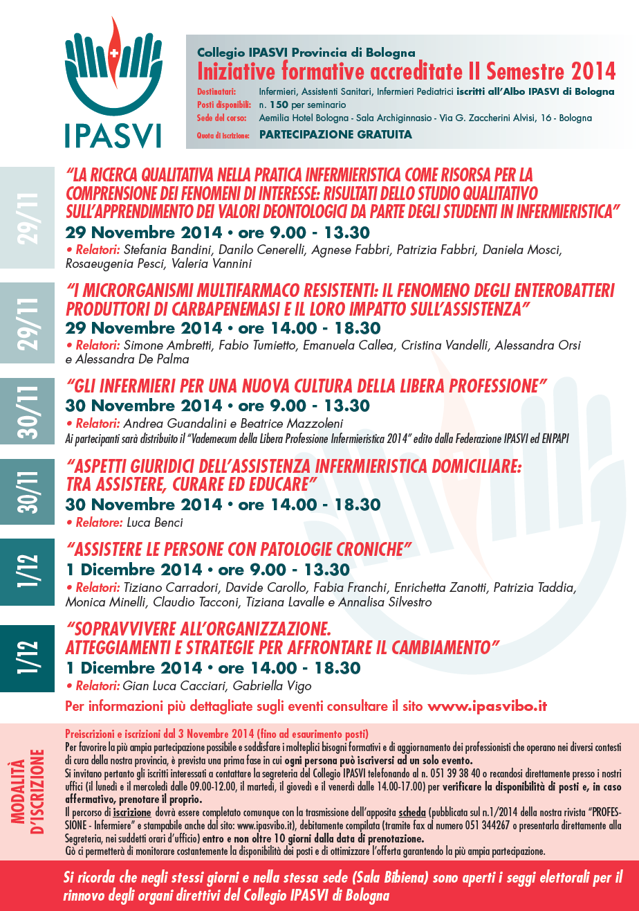 - Infermieri, Assistenti Sanitari, Infermieri Pediatrici iscritti all'Albo IPASVI di Bolonga. La partecipazione è gratuita.Iscrizioni fino ad esaurimento posti.