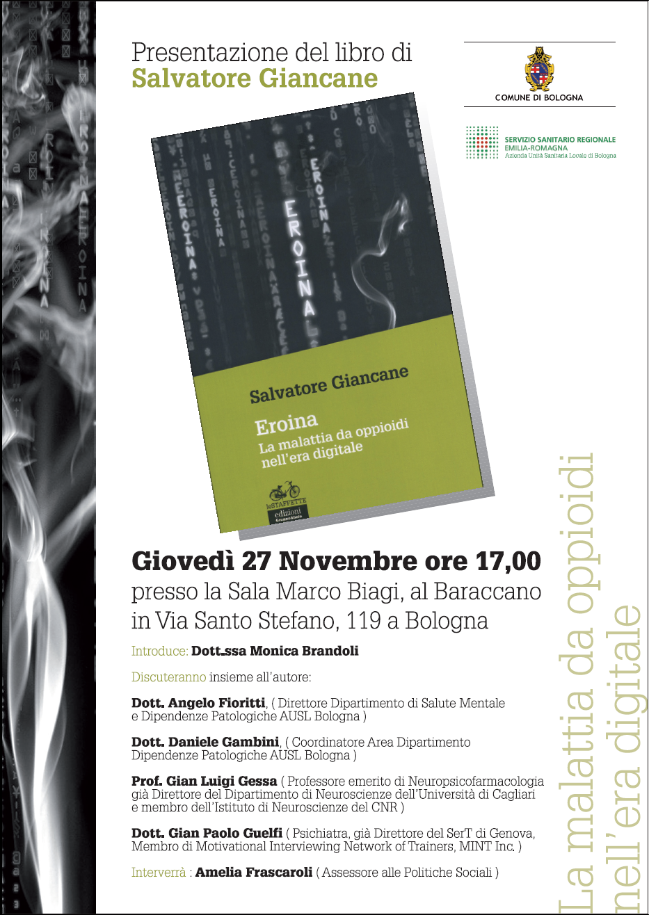 Eroina. La malattia da oppioidi nell'era digitale Presentazione del libro di Salvatore Giancane https://www.ausl.bologna.it/eventi/archivio/auslevent.2014-11-17.9612858037https://www.ausl.bologna.it/eventi/archivio/auslevent.2014-11-17.9612858037/@@download/image/Giancane.bmp