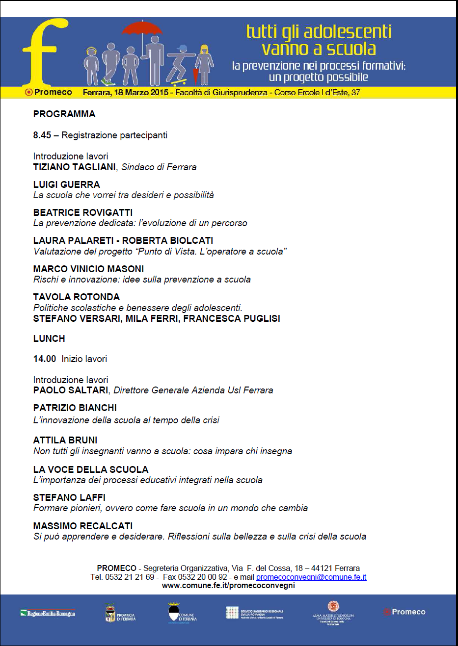 La giornata di studio, organizzata da Promeco, il servizio pubblico che nel territorio della provincia di Ferrara si occupa di prevenzione nelle scuole, intende focalizzare i propri lavori intorno alla centralità della scuola in ambito preventivo saldando gli interessi degli insegnanti, delle famiglie e degli operatori del territorio per individuare, affrontare e cercare di risolvere i problemi che i ragazzi manifestano.