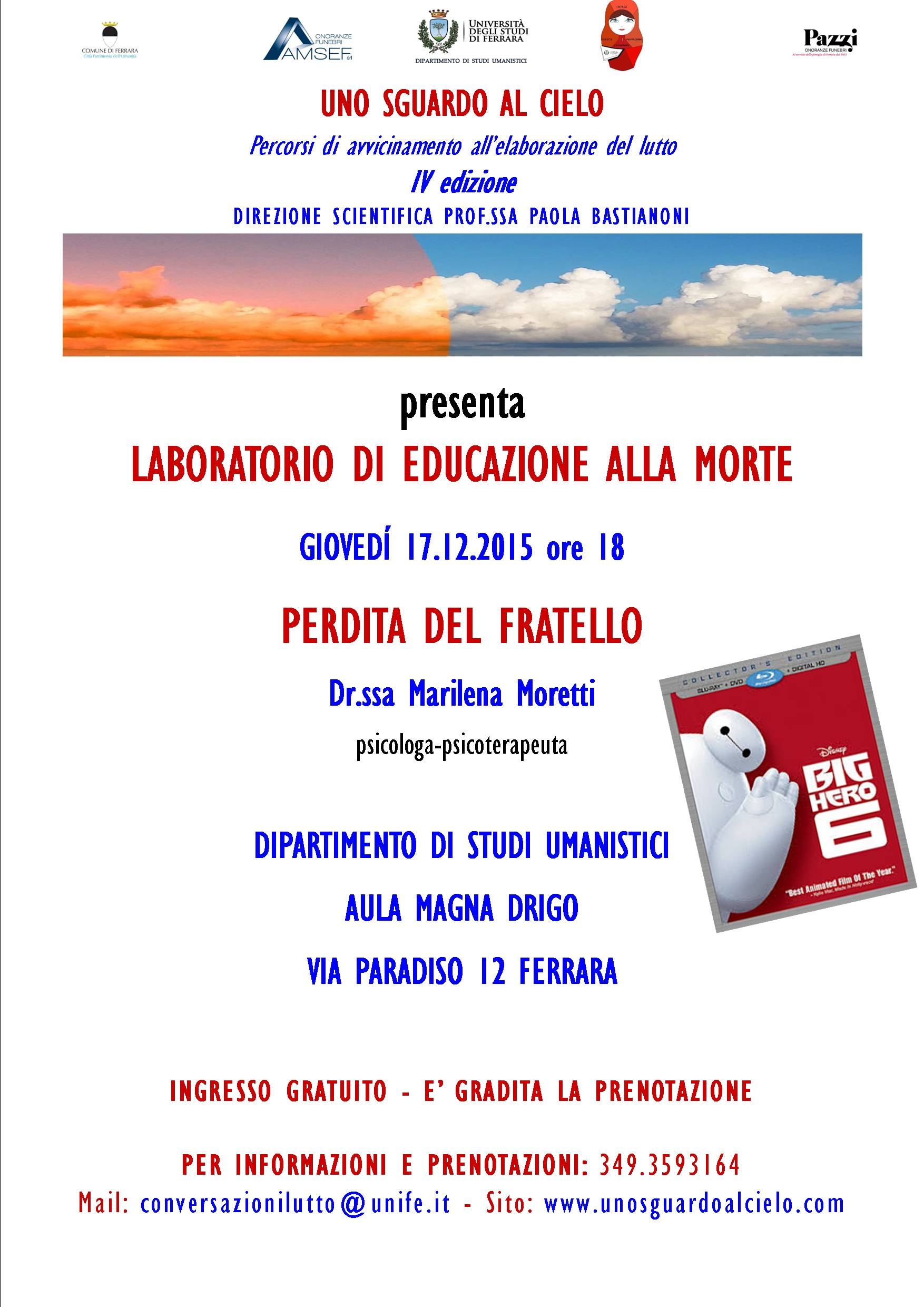 I laboratorio tratterà il tema della perdita del fratello, dal punto di vista del minore. Attraverso le sequenze del film di animazione Big Hero 6 (di Don Hall, Chris Williams, 2014), verranno individuate alcune tematiche salienti riguardante la perdita di una figura di riferimento e le sue conseguenze.