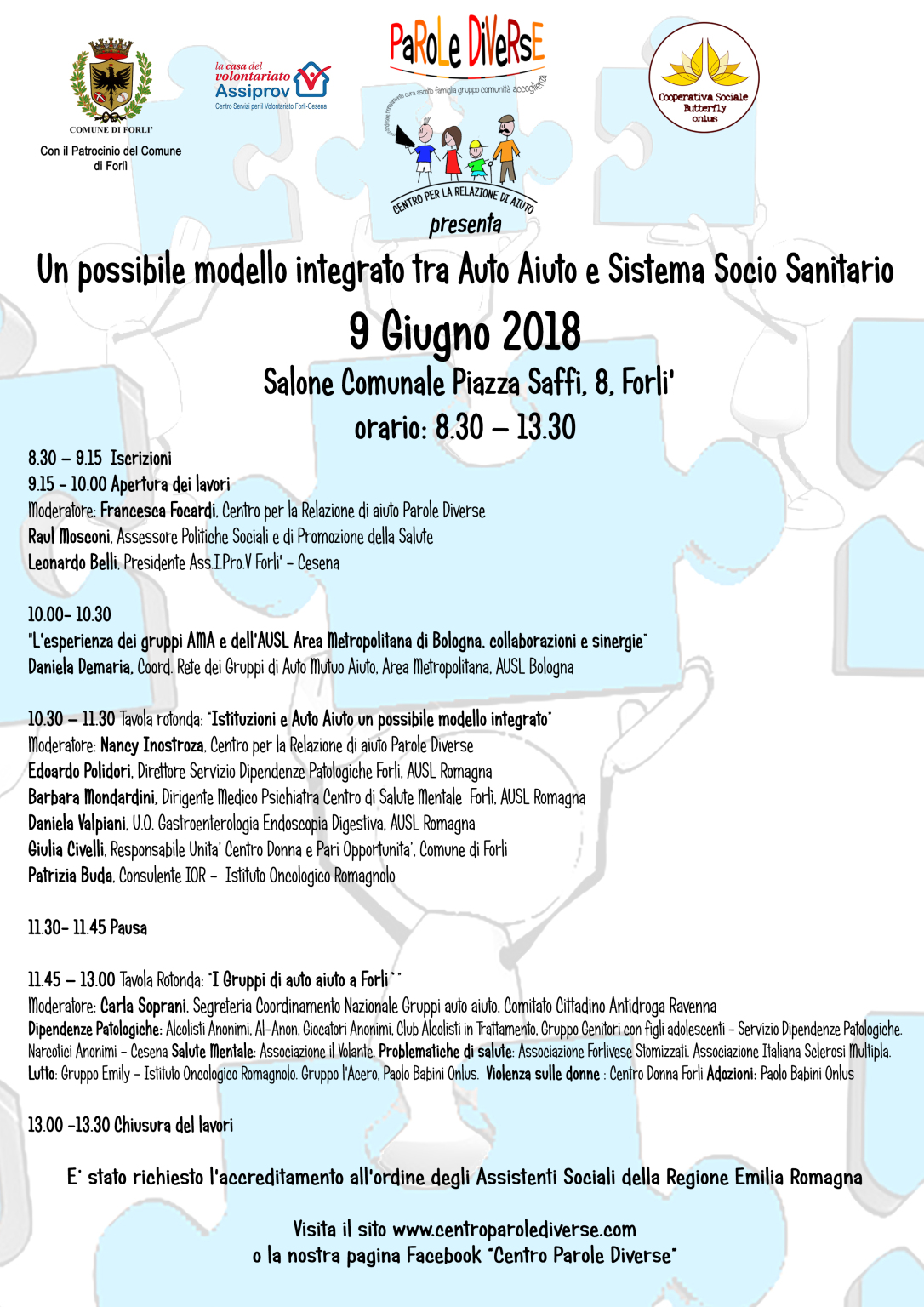 A conclusione di un anno di progettazione in collaborazione con Assiprov, per la realizzazione di una rete urbana tra i gruppi di auto aiuto nel territorio di Forlì, il Centro per la Relazione di Aiuto “Parole Diverse” desidera condividere i risultati del progetto, stimolare un dibattito cittadino sull’integrazione tra i gruppi di auto aiuto e il sistema socio-sanitario territoriale e promuovere lo strumento dei gruppi di auto aiuto.