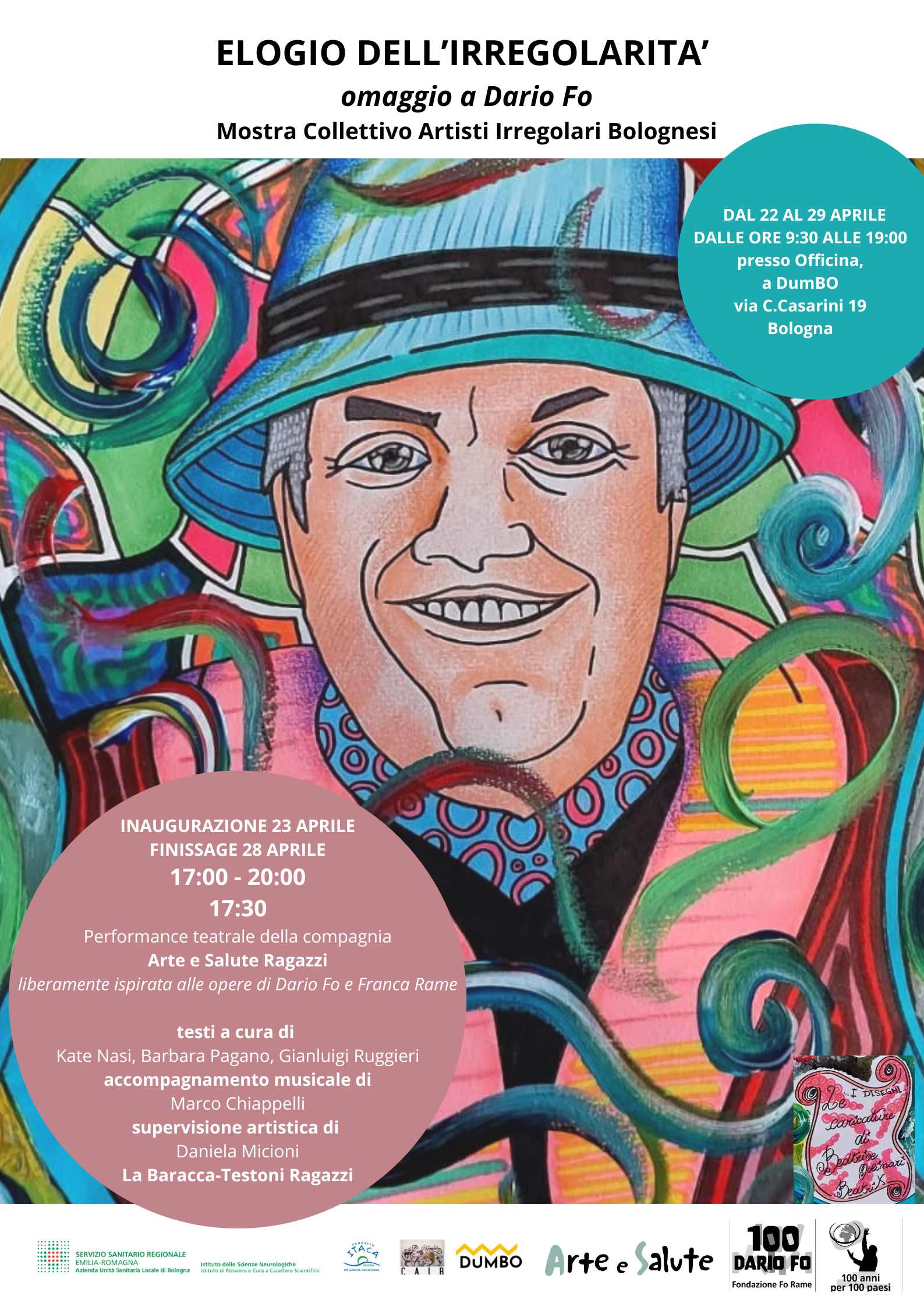 Il Collettivo Artisti Irregolari Bolognesi, nato nel 2014 dalla collaborazione tra il Dipartimento di Salute Mentale dell’AUSL di Bologna e l’allora Comitato Nobel per i Disabili – ONLUS fondata da Dario Fo, Franca Rame e Jacopo Fo (oggi Fondazione Dario Fo Franca Rame ETS) – gli dedica una mostra che è insieme omaggio e ricerca dell’arte fuori dagli schemi.