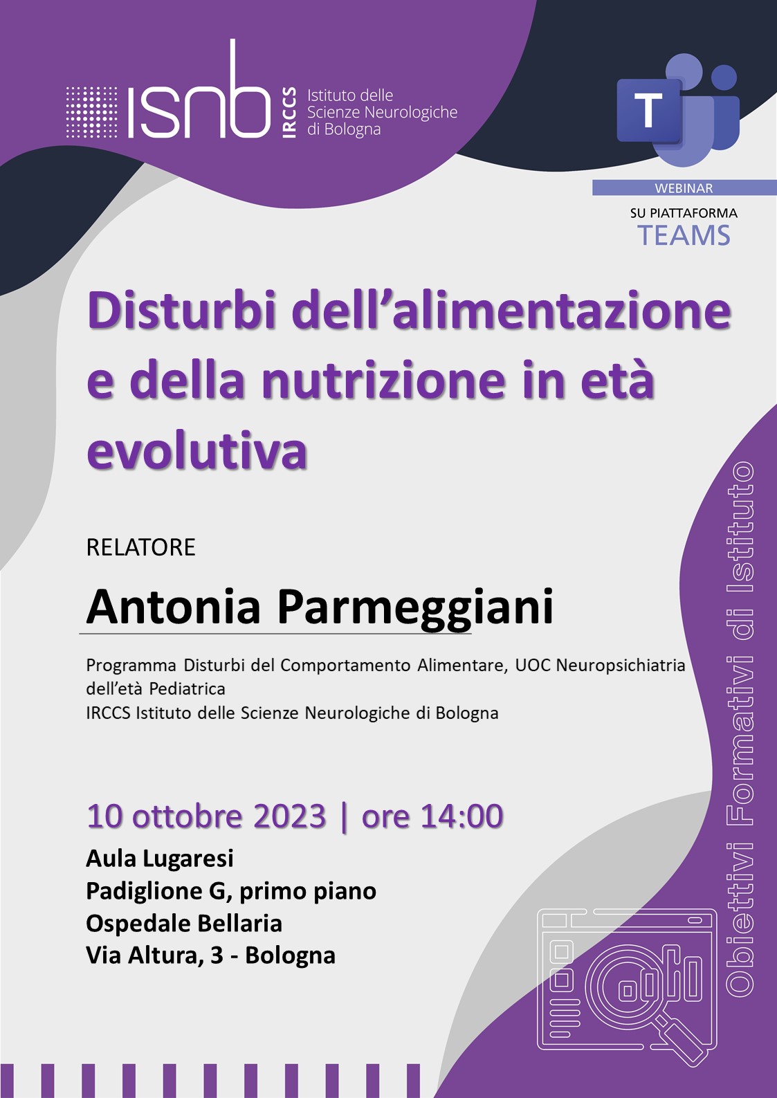 Il 10 ottobre 2023, alle ore 14:00, presso l'aula Lugaresi (ex aula B), pad. G, 1° piano, Ospedale Bellaria, si svolgerà il seminario IRCCS dal titolo "Disturbi della nutrizione e dell'alimentazione in età evolutiva", tenuto dalla Prof.ssa Antonia Parmeggiani, Responsabile del Programma Disturbi del Comportamento Alimentare.