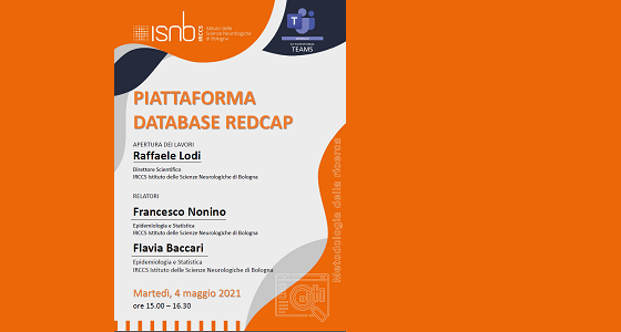 Il primo evento sarà il webinar arancione “Piattaforma Database RedCap”, che si terrà domani 4 maggio, alle ore 15. I relatori sono Francesco Nonino e Flavia Baccari, della UOSI Epidemiologia e Statistica dell’IRCCS Istituto delle Scienze Neurologiche di Bologna. Ad aprire i lavori, sarà Raffaele Lodi, Direttore Scientifico dell’Istituto. Tutti i seminari si svolgeranno su Microsoft Teams (team: IRCCS.Seminari), con collegamento avviato a partire dalle 14:45.
