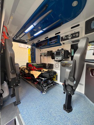Inoltre, il mezzo di soccorso dispone di una barella autocaricante con una portata massima di 300 kg, barella multilivello che prevede sistemi di anticaduta per la salvaguardia del paziente e degli operatori.