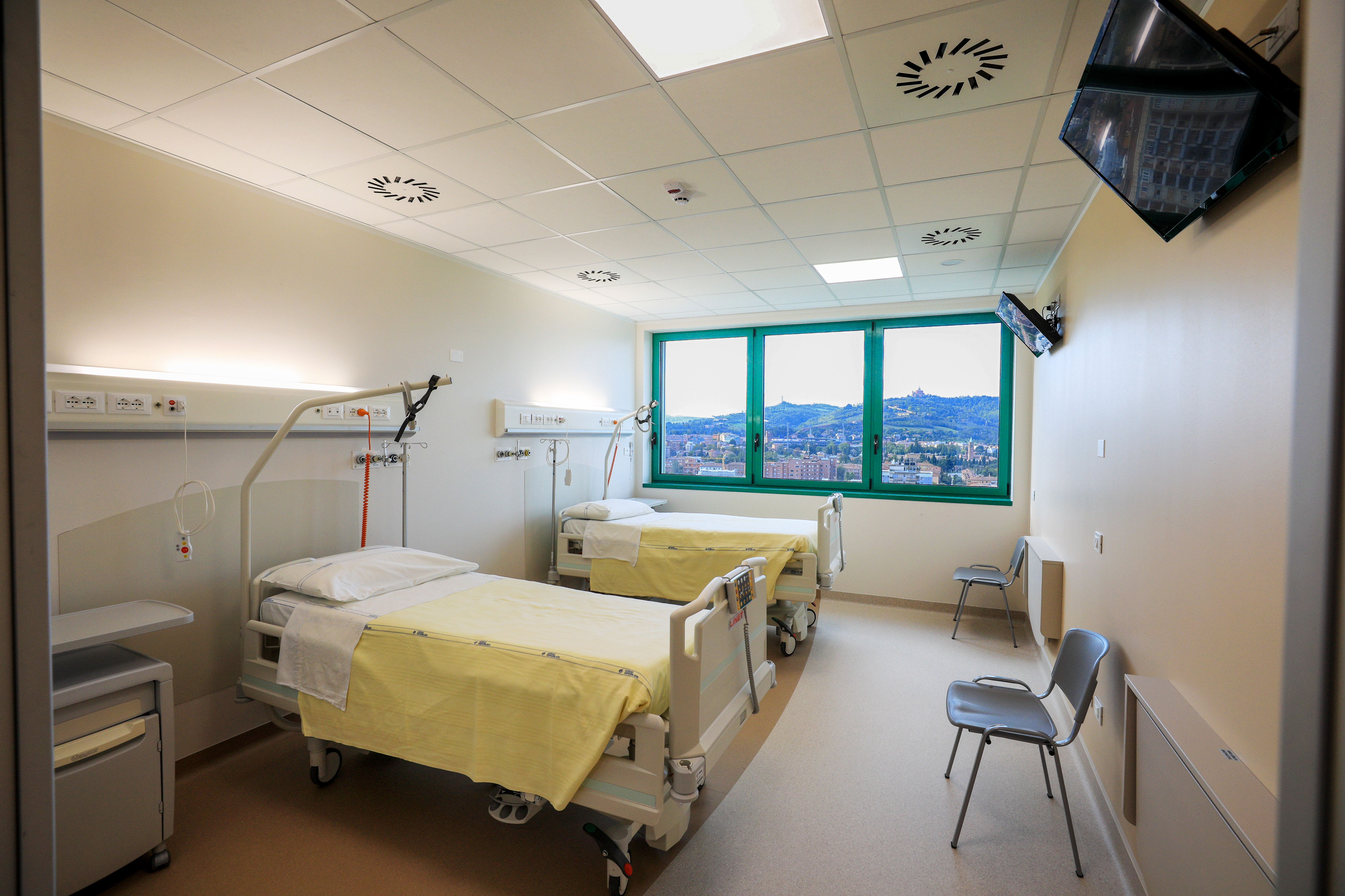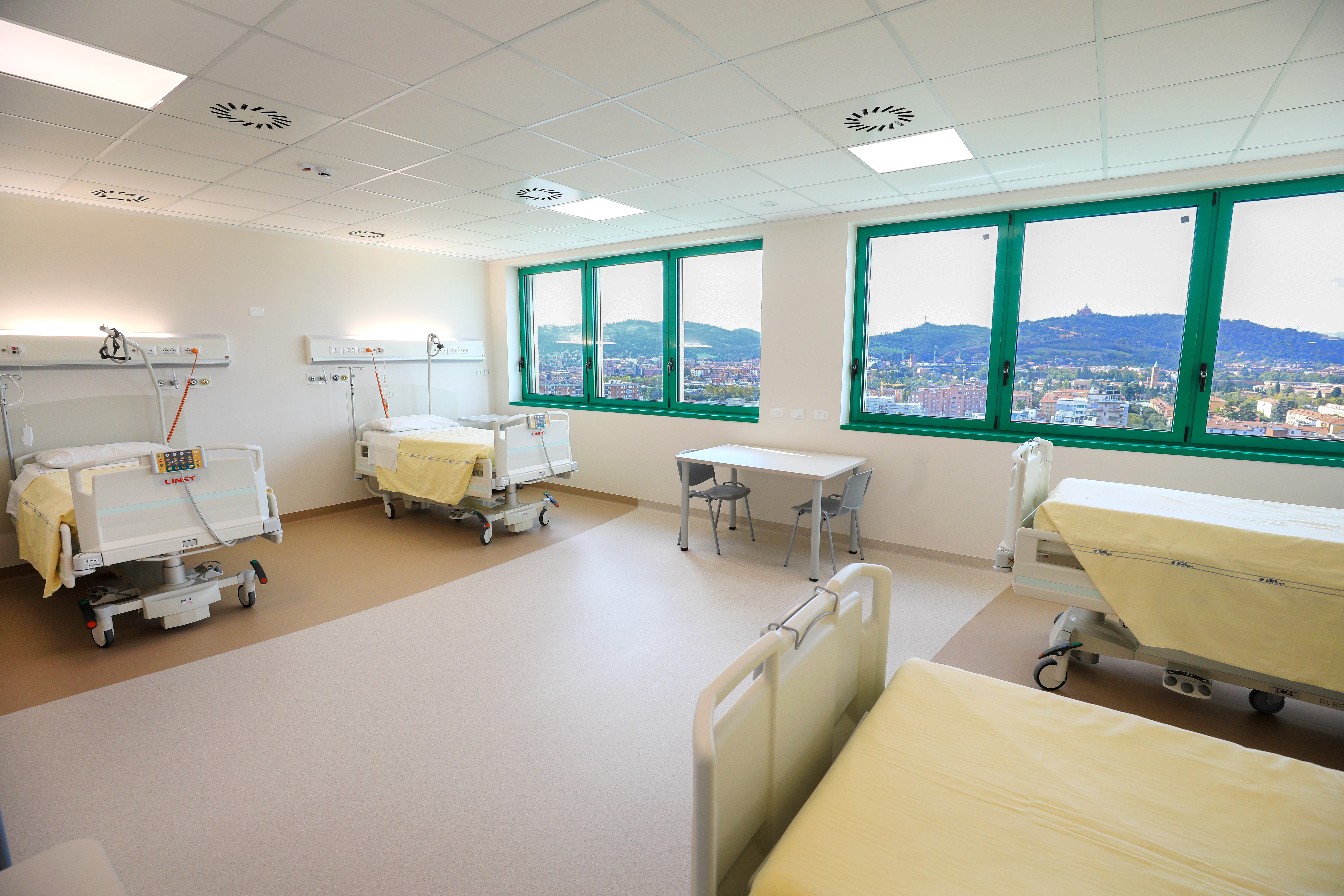 Il reparto è dotato di 36 posti letto + 2 espandibili, con stanze da due posti letto ciascuna e una stanza da 4, suddivisi in due aree per permettere una gestione più flessibile delle tipologie di degenza da ospitare, con la possibilità di creare un'area di isolamento in fondo alla seconda, con accesso controllato e degenze a singolo posto letto.