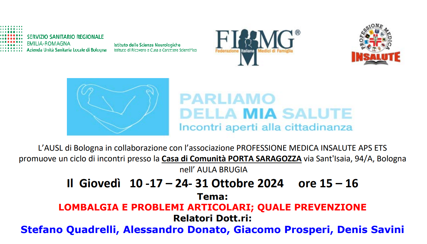Relatori il dottor Stefano Quadrelli, Medico Specialista in Fisiatria e Medicina dello Sport, già Medico di Medicina Generale, i dottori Alessandro Donato e Giacomo Prosperi, chinesiologi dell'Azienda USL di Bologna, e il dottor Denis Savini, farmacista.