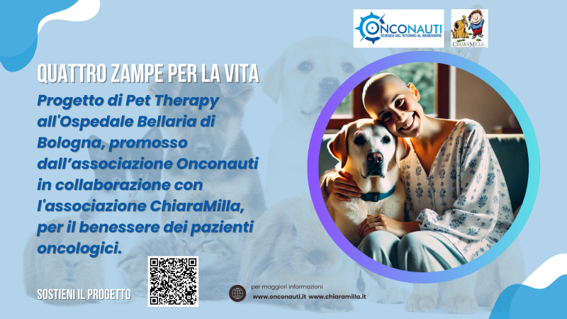 Il progetto 4 zampe per la vita: Pet therapy al fianco dei pazienti oncologici è supportato dalle associazioni Onconauti e ChiaraMilla. Entrambe le associazioni hanno un’esperienza pluri-decennale alle spalle: la prima nel supporto alle persone con diagnosi di tumore attraverso una riabilitazione oncologica integrata; la seconda negli Interventi Assistiti con Animali, come regolamentato dalla normativa e dalle linee guida regionali in materia. La collaborazione tra l’Oncologia Medica dell’Azienda USL di Bologna e queste associazioni segna un passo avanti significativo nell’umanizzazione delle cure oncologiche, integrando il supporto emotivo degli animali alle tradizionali terapie mediche.
