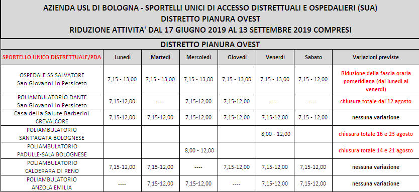 Sportelli Cup nel Distretto Pianura Ovest - Orari per l'estate 2019