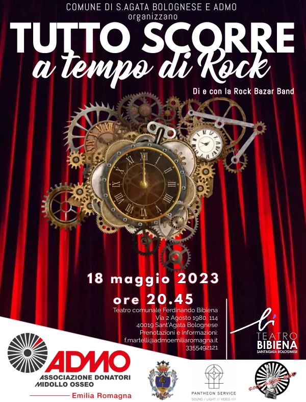 Rock Bazar Band di Sasso Marconi e l’attrice Valentia Neri mettono in scena, giovedì 18 maggio alle 20.45 al teatro Bibiena di Sant'Agata Bolognese, "Tutto scorre a tempo di Rock", un concerto/spettacolo che intende sensibilizzare il pubblico circa il tema della donazione. L’intero incasso della serata sarà integralmente devoluto in favore dell'Associazione Donatori di Midollo Osseo (ADMO) Emilia Romagna.