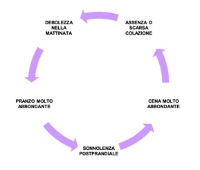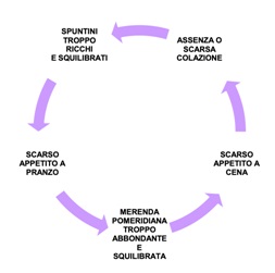 L’assenza di colazione o una colazione non adeguata comporta il consumo di spuntini più sostanziosi accompagnati da stanchezza, con conseguente livello di appetito alterato al momento del pranzo. Questo può tradursi in un pasto non adeguato, per eccesso o per difetto, e l’instaurarsi di un circolo vizioso con alterazione dell’organizzazione alimentare di tutta la giornata.