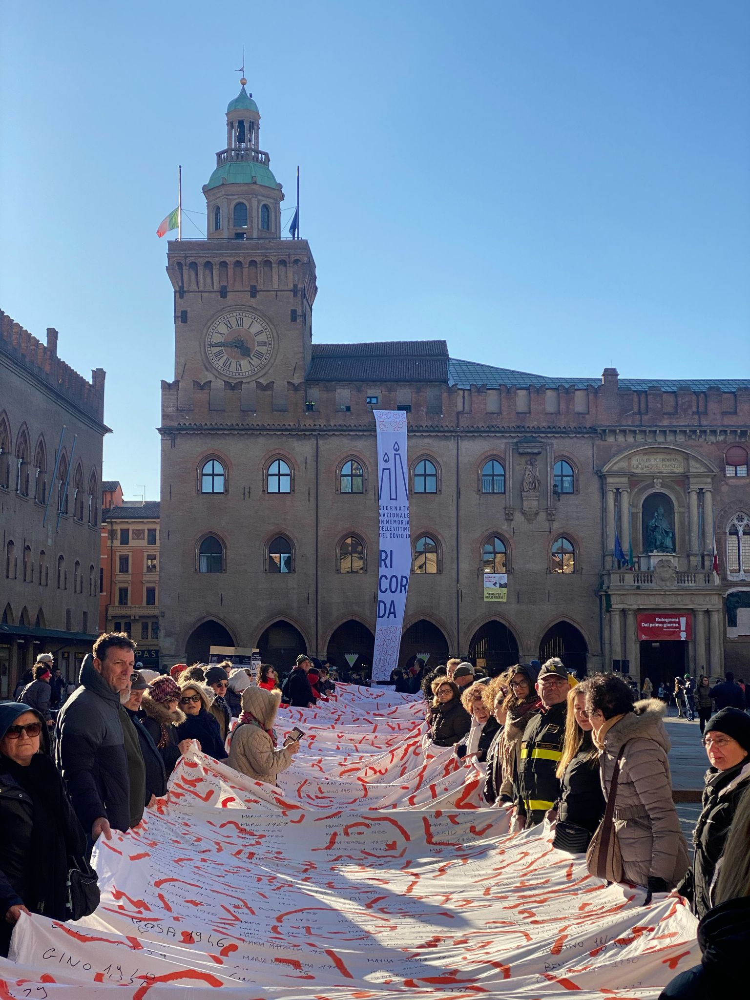 Un’unica opera d’arte collettiva, realizzata dai bolognesi in Piazza Maggiore il 18 marzo 2025, in occasione della Giornata nazionale in memoria delle vittime del Covid, composta da lenzuoli ospedalieri cuciti insieme per una lunghezza complessiva di 120 metri.
